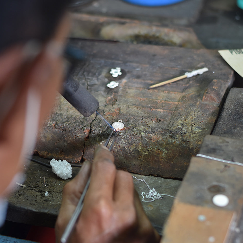 "Wir kreieren farbenfrohen Schmuck, der unsere Liebe zum Meer und zur Natur widerspiegelt. Wenn wir von "wir" sprechen, meinen wir unser wunderbares Team von Künstlern und Silberschmieden aus Bali, Indonesien, die das Herz deines Schmuckstücks sind. Die Frauen in Medewi, die jedes einzelne Armband mit Liebe anfertigen, die Silberschmiede, die immer wieder unsere Designideen für verspielte Knöpfe, Anhänger und atemberaubenden Upcycling-Meeresglasschmuck umsetzen."